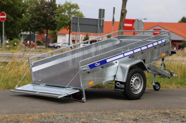 Auto Anhänger 230×125 Garden Trailer 230 KIPP Unitrailer 750 kg mit Stützrad, blauer Hochplane und Hochspriegel