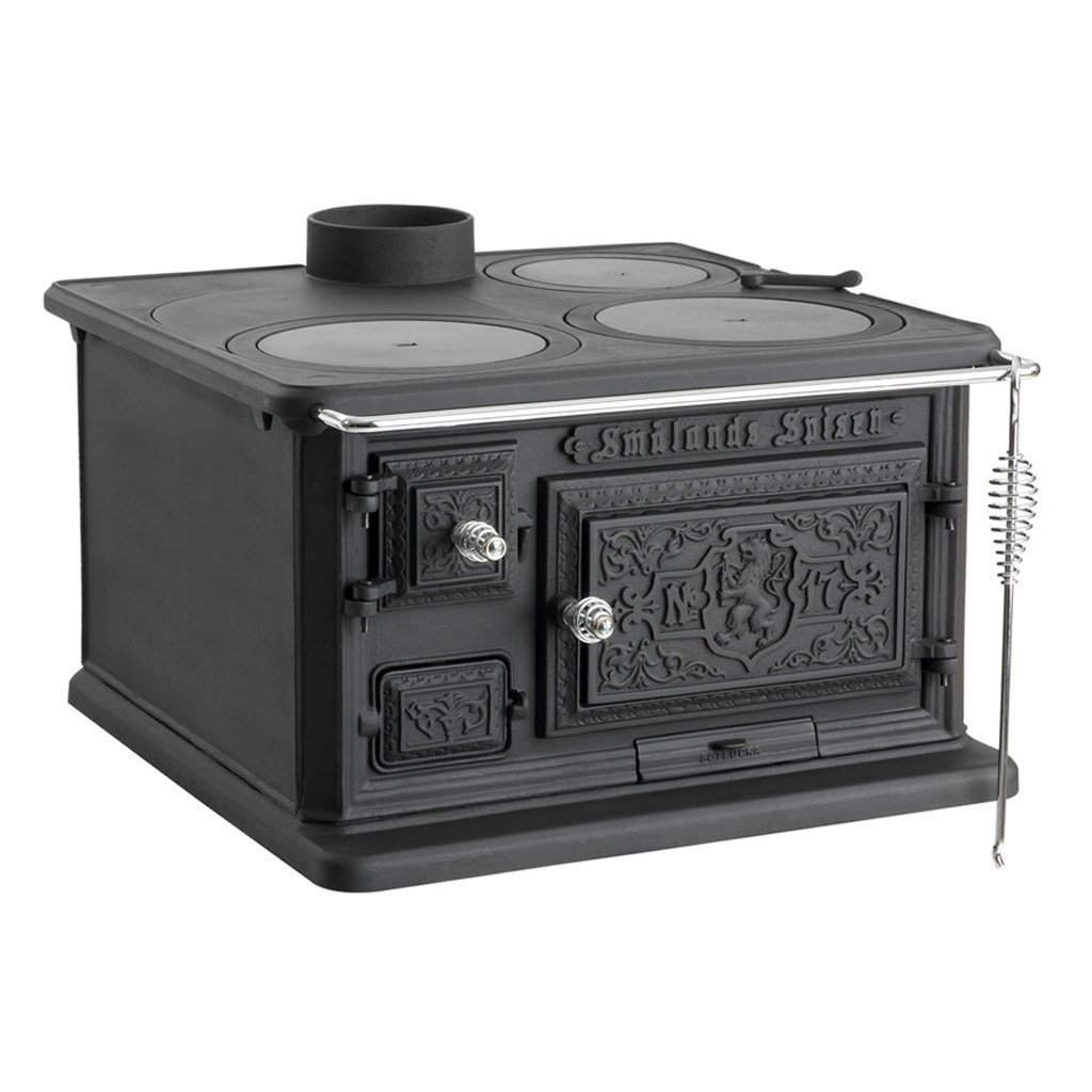 Smålands-Herd 1896 wird nach einem Vorbild von 1896 hergestellt und besteht heute aus verstärktem Guss. Das Dach des großen Backofens ist mit einer 15 mm dicken Specksteinplatte für eine gleichmäßigere Ofentemperatur und längere Wärmespeicherung verkleidet. Wenn Sie den Ofen mit Speckstein füllen, bleibt er die ganze Nacht warm. Zur schnelleren Wärmeabfuhr im Raum kann der Kaminofen auch mit Heizflanschen ergänzt werden. Schornsteinanschluss